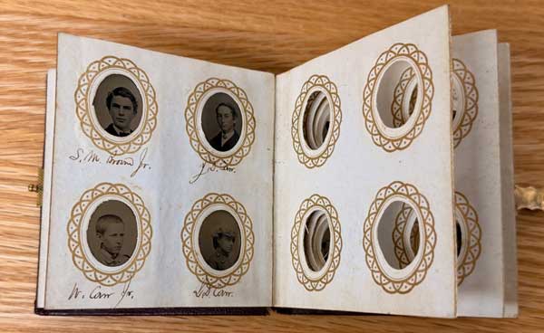 The photographs in the Carr album are gem-sized, measuring about ¾” by 1”, which was the most popular size of tintype portrait. Some were smaller, usually designed to be inserted into lockets or other pieces of jewelry, but most were sized to fit a small picture frame or, as is the case with this collection, a photo album.